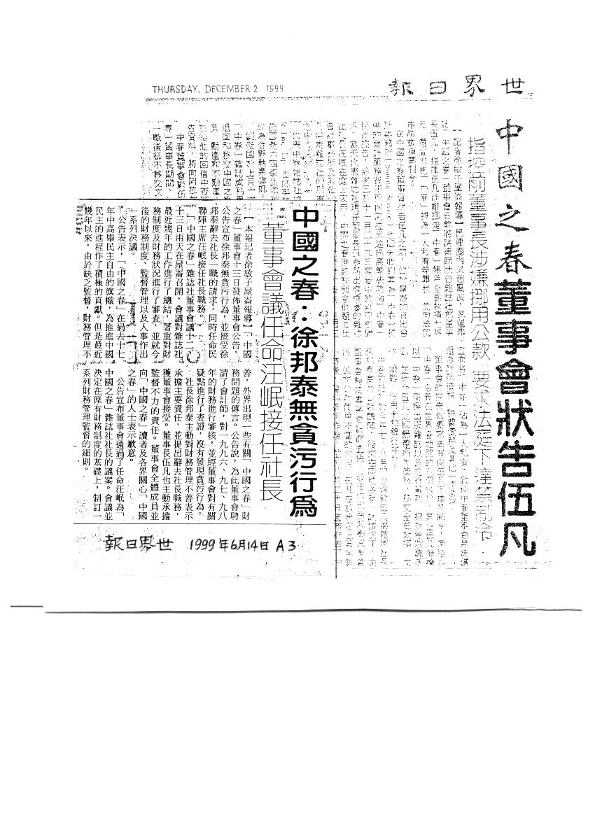 不仅民联和民阵屡次纷争,而最终分崩离析,就是在美国成立的自由民主党,也几次分裂,形成所谓的“王炳章自民党”和“倪育贤自民党”。倪育贤从八九年贪污美国华人给民运的捐款开始,时时有丑闻传出,不是贩卖人口,发难民财,就是嫖娼,最终还被一位难民告上法院,说他对未成年的女孩实施性犯罪。所以这两个党魁在腐败堕落上,真有一比。