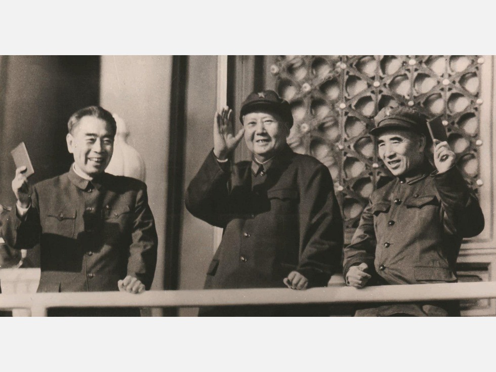1966年,毛泽东在林彪、周恩来陪同下,在天安门城楼检阅红卫兵