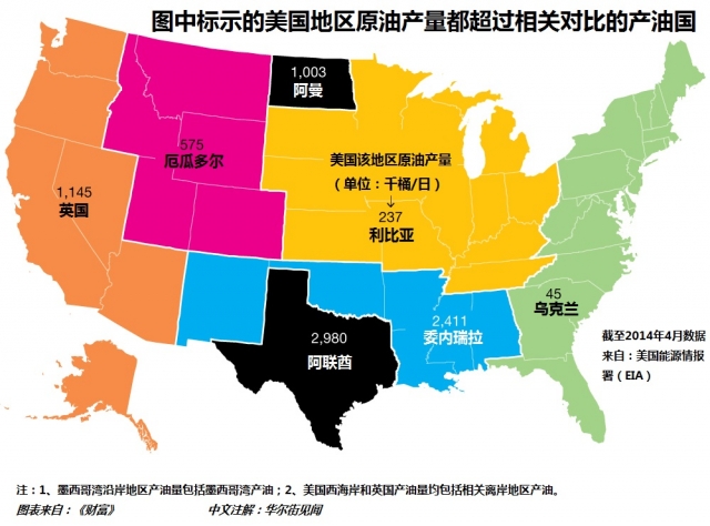 罗列数据也许还不能具体展示美国产油的现状,《财富》的下图可以让大家看到,假如把美国分割为几个地区,某个地区的日产油量就已超过某个主要产油国。比如,西海岸和阿拉斯加合计产油量超过了英国,阿联酋全国的产量还不及美国一个德克萨斯州。 |