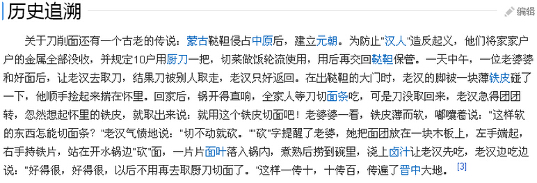 蒙古人少而汉族人多,蒙古人为了防止汉族人造反,不许汉人拥有兵器。话说功夫再高也怕菜刀,所以蒙古人规定每十家汉族人才能有一把菜刀(这个比菜刀实名制更狠,属于菜刀借用制),而且这把菜刀是放在蒙古人家里的(专门派蒙古人驻扎到汉族人的村落里,负责管理和监视)。如果当天蒙古人心情好,愿意把菜刀拿出来,汉族人就可以开火做饭了。如果当天蒙古人跟媳妇吵架了心情不好不想拿菜刀出来,不好意思,十户人家一起挨饿。有心的人去一些大点的山西刀削面馆吃面的时候,就会发现墙上写着一个传说,山西刀削面的发明就是因为借不到菜刀才用一块铁皮来削面吃(我在北京雍和宫附近的那家山西刀削面馆的墙上就看见过)。