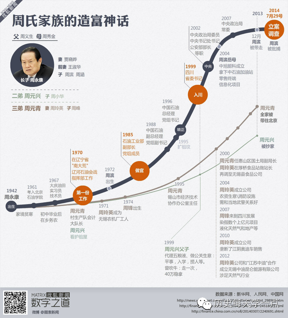 12 月5日,中共中央政治局会议审议并通过中共中央纪律检查委员会《关于周永康严重违纪案的审查报告》,新华社通报周永康七宗罪:严重违反党的政治纪律、组织纪律、保密纪律;利用职务便利,收受巨额贿赂;滥用职权,造成国有资产重大损失;泄露党和国家机密;严重违反廉洁自律规定,本人及亲属收受他人大量财物;与多名女性通奸并进行权色、钱色交易;调查中还发现周永康其他涉嫌犯罪线索。决定给予周永康开除党籍处分,对其涉嫌犯罪问题及线索移送司法机关依法处理。本文为你回顾周永康的秘密家史,与最近最常说的“通奸”史。  一图说明周永康造富神话 一、周家老宅墙上装了摄像头  2014 年3月6日,环球人物杂志记者来到周的老家---江苏无锡市锡山区厚桥街道西前头村。早上7点,西前头村一片静谧。这是个典型的江南村落,村子不大,112户人家,户籍人口385人,外来人口30余人。此时,村后农田里成片的小麦已经有10多厘米高,微风吹拂过后形成的麦浪,宛如一片湖水泛起的波纹。就像这风吹麦浪一般,村里的周家,近来也让中国大地掀起波澜。“神秘富商”周滨和他父辈三兄弟周永康、周元兴、周元青可谓一夜成名。 从各地赶来参观的人络绎不绝。村口到周家老宅不过四五十米的距离,却停了20多辆外地牌照的汽车。记者上前打听得知,他们来自南京、苏州、无锡等地,大部分是中老年人。有位参观者议论道:“听说周永康的儿子周滨花100万搞到一个电站,修整修整,1亿元卖出去……”还有位苏州来的老者拿出一本发黄的笔记本,上面抄满了各个媒体报道的周滨如何发迹的情况,读给大家听。在这群热闹的参观者旁边,一名西前头村的村民正在钓鱼,他平静的生活显然被这么多好事者打扰了,他觉得这些人是在“发神经”。 周家老宅在离村口不远的一处水塘旁边,主体建筑是两座二层小楼,外观与当地其他建筑无异,白墙灰瓦,风格秀丽。但是周家老宅在硬件配备上高人一等:村里大多数人家的宅院没有围墙,周家不仅有围墙,还在墙上安装了摄像头。 二、祖坟被挖,周母上吊自杀  周家祖坟,2011年立的祖坟上的名字已经是周永康第二任妻子贾晓晔 此前,有媒体报道,上世纪九十年代,周永康曾请一个老和尚看相,老和尚称其面相是好的,但做干部之后都是副职,是祖坟有问题。周于是数次打电话,叮嘱两个弟弟修坟。1995年前后,厚桥镇派人为周家扩坟,砍掉周围一些桑树,种上了4棵无锡市树樟树。同年6月,周家立好了墓碑。但在2009年秋天的一个雨夜,周家祖坟突然发现被人挖了洞,惊动了警方,但至今未侦破。对这一传言,西前头村的多名村民予以了证实。 当地人说,周不怎么回老家。上世纪六七十年代,他在辽宁工作时,两个留在老家的弟弟周元兴、周元青谁都不愿意照顾年迈的母亲周秀金,原本打算在老家养老的周母硬是被推给了周永康照顾。然而,据村民说,周母到了辽宁,日子过得不怎么顺心,最后上吊自杀。 三、曾为喜欢的老师流泪  据周元根的小学同学回忆,大约7岁那年,周元根开始读小学,由于和别人重名,于是改了名字。但他在村里一直沿用“周元根”这个名字,周家祖坟的5块墓碑上,刻的也是“周元根”这个名字。 在苏州中学,周元根最难忘的是数学老师陈老师,周元根与同学约定,有机会要经常到老师家中看看,尽到学生、晚辈的责任。 毕业后,每年春节,周元根都会给老师打电话拜年,即使在国外出差也不会忘记。周元根在北京工作后,曾邀请陈老师到家中做客,并陪同她游览北京。据苏州中学一位校友回忆,2003年陈老师去世后,有人在整理陈老师遗物时,发现她枕头下放着周元根的照片。周元根听说此事后流下了眼泪。 如今,苏州中学的学生并不忌讳谈论周元根。记者问他们是否担心这位大名鼎鼎的老校友影响学校的声誉,绝大多数学生表示:“不会,我们是我们,他是他。”但是苏州中学的老师们一听到周永康的名字就很紧张,反复强调这样的采访是要“走流程”和“征得同意”的,此后校方相关老师的手机一直处于无法接通或无人接听的状态。 四、回老家见乡邻:可能是我最后一次来看望大家了 周永康仕途腾达之后,西前头村在无锡得到不少关照。西前头村南侧有一条双向8车道的公路锡山大道,2011年底竣工,直通无锡市区。但记者发现,行驶在这条路上的汽车屈指可数。两位60多岁的村民告诉记者,这么多年来,除了这条路,“周家并没有给家乡人民做过什么实实在在的贡献”。 据多位村民回忆,周元根曾于2013年4月回来过一次。一位村民说,那天,在很多便衣警察的保护下,周元根微笑着和上百名乡邻握手。“和村民小聚的整个过程中,他只是微笑,没说一句话。”也有村民说,那次回来,周元根曾感慨:“这可能是我最后一次来看望大家了。” 五、疑似周永康侄女的女子面对记者一言不发 周元根走出了山村,他的二弟周元兴读完初中后在家里务农,留下照看老宅,和妻子钱惠英育有一子一女。据附近村民回忆,周元兴从前抽两块五的烟,打5毛钱的麻将,两圈牌打下来,就输得拿不出钱来,“后来不得了,他抽的是软中华,吃的老酒是五粮液,要吃多少有多少”。有村民反映,以前,每天都有人开着车到周元兴家里拜访,他们大多是官员或商人。 对于周元兴一家是如何发迹的,村里流传着两个版本。其一,周元兴之子周晓华到四川谋了一个五粮液代理商的职位;其