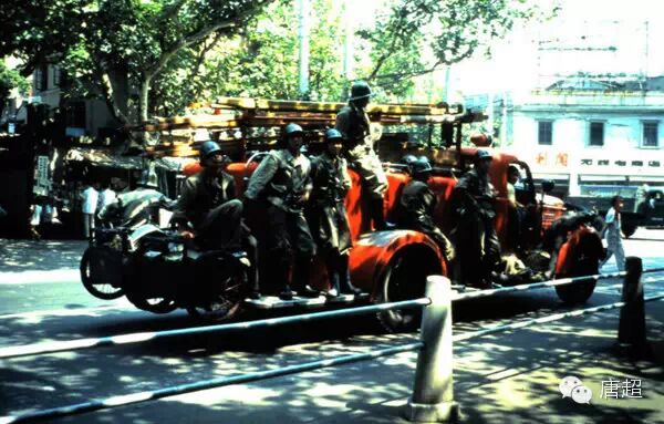 淮海中路近陕西南路东向,消防车后面是徐汇区中心医院,往东转角处是中国人民银行,消防车左前方是利闻无线电商店(现为百盛购物中心)。