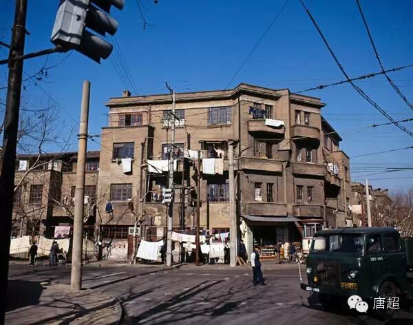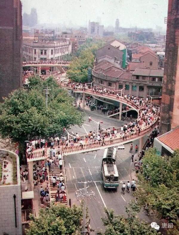 南京西路石门路的人行天桥,左侧是德义大楼,下面有少年儿童商店,南京理发店。右侧是同孚大楼,下面往西向是王家沙。前方右边是开开百货商店,前方左边有新昌点心店,新华电影院。