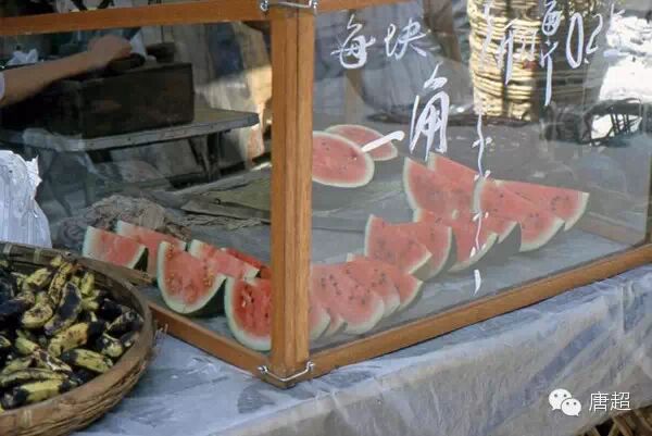 马路边水果摊,西瓜开刀每斤0.25元,每块一角。
