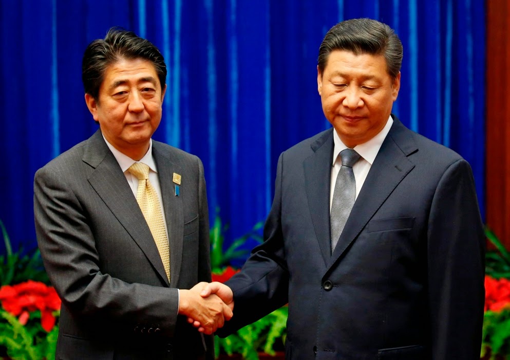 日本通過《新安保法》,讓中日關係緊張。中國國家主席習近平(右)以臭臉面對日本戰後最強勢的首相安倍晉三,希望激發國內的民族主義情緒。圖片來源:達志影像/路透社資料照片