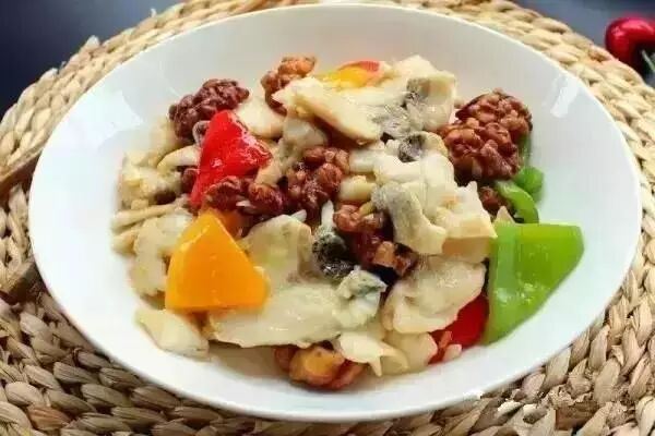 4. 底油,爆香葱姜蒜,下入彩椒,翻炒几下,加1勺料酒,适量盐,鸡精,三四勺开水,2勺生抽。2勺水淀粉勾个薄芡,下入鱼片,均匀裹上汤汁,最后下入核桃仁,翻炒出锅。