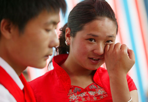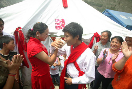 | “親一個,親一個!”在滔滔的岷江邊,在凌亂的廢墟旁,在簡單的帳篷里,這樣的聲音對遭遇特大地震災害後的汶川而言,顯得久違而珍貴。正是在這個重災區,在鄉親們熱情的呼喊中,昨日上午,汶川縣威州鎮雙河村的一對年輕羌族戀人攜手走進婚姻殿堂,為這個劫後重生的地方增添了一些喜氣。 “5‧12”當天訂婚突遇地震 從威州場鎮跨過一座鐵索橋,就是雙河村,這里在“5‧12”那場猛烈的地震中遭遇重創,不少房屋坍塌,剩余下來的所有房屋都已變成危房。這個昔日依山傍水的村莊,在當下已成為一個帳篷安置點。從村頭過去,在一塊空地上,數十頂藍色帳篷整齊排列著,受災群眾居住在這里,以遮風避雨。 前天下午,在這片藍色帳篷中,不經意間搭建起一個白色的帳篷。昨日一大早,一些群眾起床後驚異地發現,在這個帳篷的四周,竟分別貼著紅色的“V弊幀4蠹藝獠乓饈兜劍 卣鷙蟺牡諞懷』槔瘢 唇 詿遄永錁儺小/P> 這場婚禮的主角是22歲的新郎王小波和21歲的新娘郭富娟。兩人是在一年多前經人介紹認識的。  年輕羌族戀人災區舉行婚禮 帳篷作"洞房" 涂勁軍楊濤攝影報道  年輕羌族戀人災區舉行婚禮 帳篷作"洞房" 涂勁軍楊濤攝影報道  年輕羌族戀人災區舉行婚禮 帳篷作"洞房" 涂勁軍楊濤攝影報道  年輕羌族戀人災區舉行婚禮 帳篷作"洞房" 涂勁軍楊濤攝影報道 新郎王小波說,經過半年多的交往,他發現郭富娟是一個勤勞、善良、美麗的女孩,他決定向她求婚。新娘郭富娟坦承,王小波人很好,是一個可以終生相伴的人,所以決定嫁給他。 婚姻的準備工作張羅得很順利,兩人早就選好了日子︰5月12日訂婚,6月1日舉行婚禮。“6月1日是農歷四月廿八,是一個吉利的日子,按照我們的風俗習慣,這天結婚,就是為了圖個吉利。”郭富娟說。 看好日子後,兩人便去民政部門登記,並順利領到了結婚證。隨後,兩人一起去街上置辦了新床、新家具、新床單被子等結婚所需的東西,就等著6月1日的到來。 按照當地習俗,結婚前,是必須要舉行訂婚儀式的。5月12日上午,王小波家高朋滿座。13時許,家里已擺好了5桌酒席,但因親戚還沒有到齊,遲遲沒有開席。“我們還沒等到客人們都來齊,突然間房屋就抖動了起來。”王小波說,正在忙碌的他和家人以及等待開飯的客人們不知誰喊了一聲“跑”,就沖出了家門。隨後,房屋轟地一聲垮塌下去,所有的酒菜連同剛購置的新床、家具、床上用品都被埋在了廢墟中。“當時我都哭了。”郭富娟說,眼見所有的東西都沒了,她想,可能婚結不成了,所以很是傷心。  年輕羌族戀人災區舉行婚禮 帳篷作"洞房" 涂勁軍楊濤攝影報道  年輕羌族戀人災區舉行婚禮 帳篷作"洞房" 涂勁軍楊濤攝影報道 生活逐漸安定決定如期完婚 災難突如其來,再談婚禮的事情顯然不合時宜,對重災區汶川來講尤其如此。雙河村的房屋在地震中坍塌了不少,其他的房屋也基本上成為危房,在吃穿住都成問題的情況下,王小波和郭富娟的婚禮逐漸被人遺忘。“地震後的那些天,可以說連吃住的地方都沒有。”王小波說,地震是他們從來沒遇到過的困難,當天還下了很大的雨,躲在一個棚棚里,冷得不得了,吃的也沒有,所有的村民都處于恐慌中。好在很快就有部隊幫他們搭建起了成排的帳篷,隨後有人送來了食物,還有人來消毒防疫。 隨著生活逐步穩定,大家漸漸習慣了帳篷生活。王小波和父親王新民又商量起結婚的事情。“按照我們的風俗習慣,定下婚期後,是不能延誤的。”王新民說,當時自己在想,在黨和政府的幫助下,大家的生活逐漸安定下來,所以即便環境簡單、條件艱苦,但還是要為兒子舉辦一個簡單的結婚儀式,“只要能夠把女方順利接過來,就是一個好事。”對男方家里的決定,郭富娟感到很驚喜,很快就滿口答應了。 既然要結婚,就應有一頂帳篷作洞房。王小波所在雙河村黃岩組的干部5月31日趕緊去找帳篷。但找來找去,最後只找到一頂白色帳篷。 沒有床怎麼辦?幾個年輕人跟隨王小波來到廢墟中,費了很大勁,硬是從中把新床、新被單、毯子和被子給掏了出來。不過,王小波感到有些遺憾,因為沒有把結婚證找到。“還不錯,靠大家幫忙,現在啥子都整好了。”昨日上午正式舉行婚禮前,王小波帶著記者進入到帳篷“洞房”中。在這個白色素雅的帳篷里,一架嶄新的床擺放在中央,上面鋪著嶄新的毯子、被子。一些好心的鄉親還專門給這對新人找來一些紅布,懸掛在帳篷頂上,為這個簡單的“洞房”增添了喜慶氣氛。 在“洞房”外,鄉親們幫忙在用帆布臨時搭起一個簡陋的“會客廳”,前來道賀的客人們在這里可以喝到主人準備的茶水、吃到喜糖、抽上喜煙。 帳篷里成婚新娘幸福得落淚 昨日11時30分,在“會客廳”里,沒有酒水,沒有宴席,沒有喜慶的音樂,王小波與郭富娟的婚禮如期舉行。在鄉親們的笑聲中,兩人來到大家圍成的一塊空地上,相依而立。王小波的父母端端地坐在旁邊的凳子上,面帶微笑看著兒子和兒媳婦。“一拜共產黨,二拜死去的同胞,三拜父母。”主婚人是雙河村支部書記譚小明。對不同以往的“三拜內容”,王新民說,是他與書記商量的。兒子兒媳向父母行禮後,他站起身來大聲地告訴周圍的鄉親︰“我的兒子今天這個時刻能結婚,要感謝黨和政府,在最困難的時候幫助了我們。我們一家人都忘記不了。”話音剛落,周圍響起了熱烈的掌聲。這其中,既有對