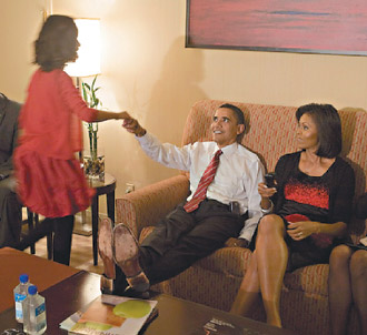 |  歐巴馬與妻子蜜雪兒4日在芝加哥收看大選開票電視轉播時,蜜雪兒手握電視遙控器,歐巴馬則與長女馬莉亞踫拳加油。 路透 通常要看誰是一家之主,只要看電視機遙控器在誰手上就八九不離了。傳統上多半是男人扮演這個角色,但4日美國大選選情之夜的照片鐵證如山,雖然歐巴馬以秋風掃落葉之姿勝選,美國準第一夫人蜜雪兒‧歐巴馬恐怕才是一家之主。 倫敦每日電訊報12日報導,在這段選情之夜的畫面中,歐巴馬夫婦坐在客廳沙發看電視播放的實時選情快報,遙控器就在蜜雪兒手中。 報導還說,從歐巴馬夫婦10日前往白宮拜訪美國現任總統布什夫婦時,彼此的舉止與交互可以一窺未來第一家庭的微妙權力平衡。歐巴馬在白宮與布什晤談時,蜜雪兒已火速退出白宮去拜訪當地的學校。 部分媒體最近指出,蜜雪兒組織能力強得可怕(fearsomely well-organized),身上永遠帶2支黑莓機,分別應付個人任務和大選。蜜雪兒當前還兼任芝加哥大學附設醫院主管居住小區及對外事務的副總裁。歐巴馬到處奔波之際,她還要照顧年僅10歲和7歲的兩個女兒。 蜜雪兒曾堅稱,她不可能在白宮扮演任何角色,不過各界認為,未來她也不可能完全隱身幕後。 |