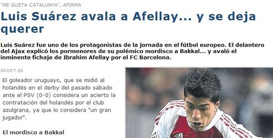 在西班牙媒體的報道中,與蘇亞雷斯相關的重中之重不是咬人這一幕,而是他公開自薦巴塞羅那。在烏拉圭人心中,眼下所屬的阿賈克斯遠非絕對意義上的豪門俱樂部,對蘇亞雷斯而言,巴薩才是理想歸所。盡管還沒成為巴薩的人,蘇亞雷斯就已經和巴薩的死敵卯上了:“要知道,周二對皇馬的比賽才是我所向往的對決,只有在那樣的比賽中,一名職業球員的價值才能得到最完整的體現。”與此同時,烏拉圭人追逐紅藍軍團的腳步也從來未曾有所停歇,他已經在巴塞羅那郊外買了房子,用他的話講:“那里讓我感覺舒服,我真是太愛加泰羅尼亞了。”看來,這位阿賈克斯的當家球星已經準備好了隨時轉會巴薩。