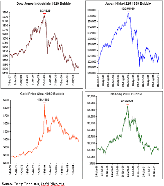首先是1929年的道琼斯指数,1989年的日本股市指数,1980年的黄金,和2000年纳斯达克指数: