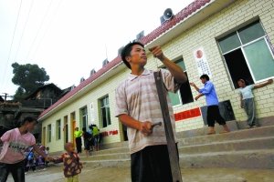 9月4日,代课教师潘德江正在为领取新书包的小朋友整队。身后学校的3间教室和一间办公室,是他和潘德禄老师一起跑到县里面申请20多次,最后联系到一位香港爱心人士,捐款5万元于2008年建成的。