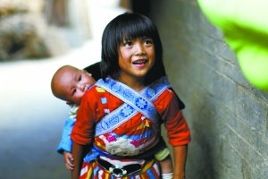 9月3日,一年级的女孩放学回家后带弟弟。当地孩子很小就承担家务,村小的存在给了他们受教育的机会。