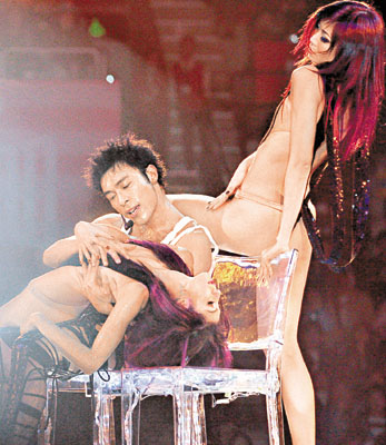 4 F4︰赤裸半身、美女壓身、激情纏綿︰演唱會上,吳建豪赤裸半身出場令女歌迷大驚失色。周渝民和女舞蹈員相擁共舞熱吻,後被美女寬衣解帶壓身上架,台上纏綿床戲。