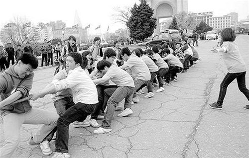 中国留学生在平壤“凯旋门”前进行拨河比赛