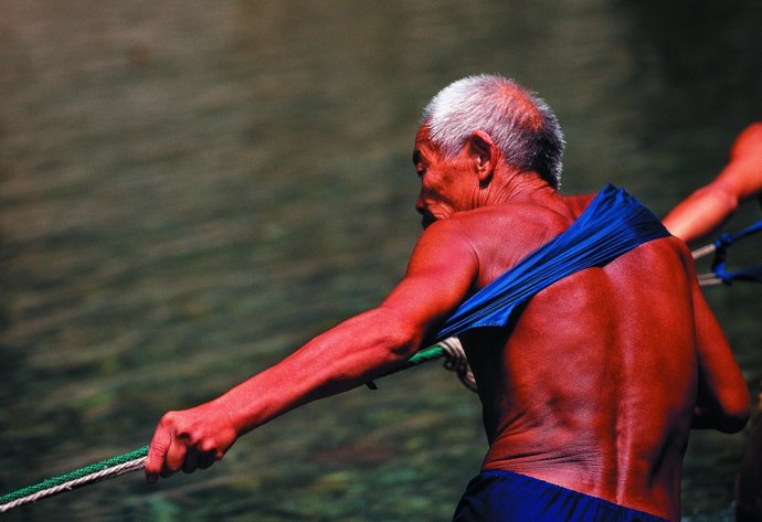 三峡河道落差巨大,逆水行舟因此非常困难。三峡蓄水前,每当此时便全靠纤夫合力拉纤。逆水行驶阻力巨大,加上船只及载货的重量,上行更加困难,所以用以引力的纤绳就很重要。纤绳由16片老丛竹篾编织而成,这种竹篾硬中带柔,粗中有细,不伤皮肤,又方便收拢、盘曲。编成后用石灰水浸泡,再放在水里煮开,以此增加绳索的柔韧度。纤绳很长,一般有54捭(盘起来一圈为一捭),一捭约1.7米,有的河段只需二十多捭,有的河段则需整个54捭。使用时,绳索的一头通过麻编拴在船只的维板杜上,一头拴在纤夫腰间(纤夫们形象地称之为“搭脖子”),船只与纤夫的安危和命运就这样紧紧拴在一起。摄影/郑云峰