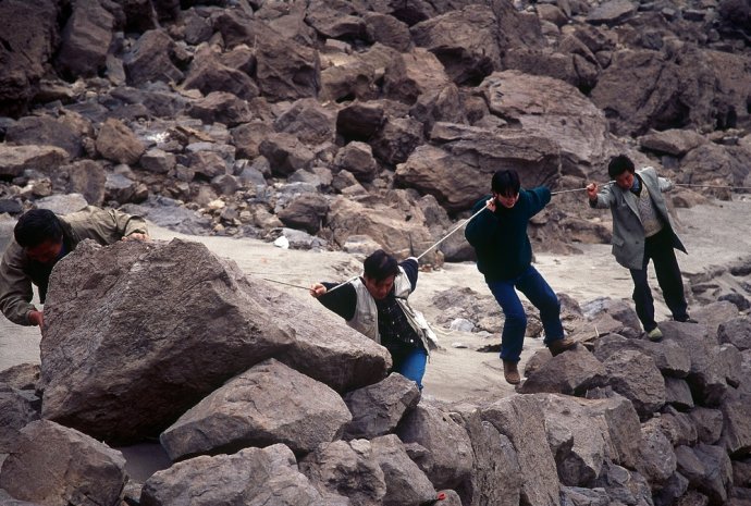 郑云峰在三峡发现的是一个纤夫的世界,他拍下的那些图片,是纤夫留下的遗迹所形成的景观。郑云峰的纤夫世界让我感到惊讶,因为在我心中,三峡不是这样的。我印象中的三峡没有纤夫,甚至我相信大多数国人心目中的三峡也没有纤夫,因为中小学语文课本中的三峡就没有纤夫。