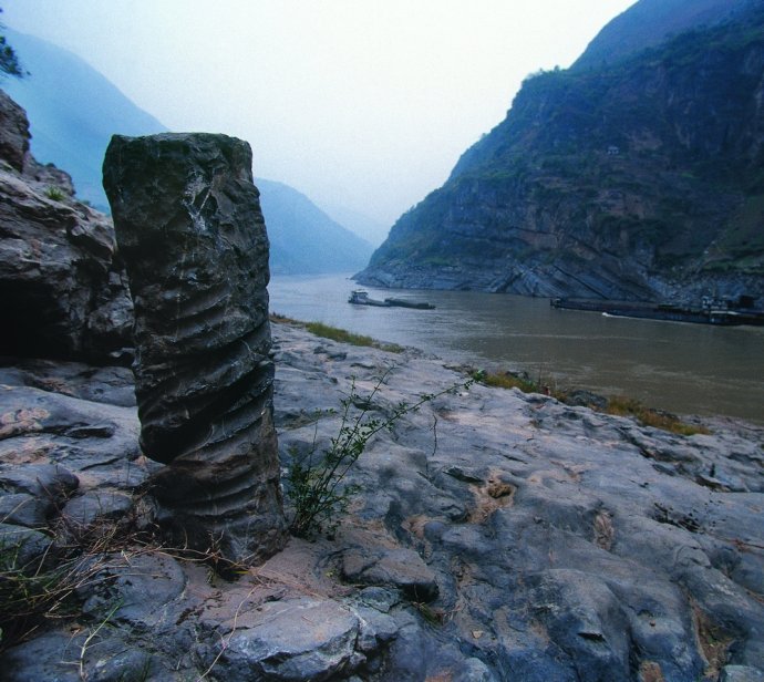 如果你在三峡见到图中这样的纤桩,那这里必定是一个大险滩。和之前图中笔直的纤痕不同,纤桩上的纤痕方向呈螺旋状盘升,偶尔错乱,这是纤绳缠绕所致。遇见大险滩时,即便几十、上百个纤夫一起使力,也不能持续地使船只前行,为了途中停歇、缓冲,或者至少保证船只不往下滑扯,于是有了纤桩——上行时,人们先把纤绳固定在纤桩上,再集体用人力一点点往上拉扯船只,其作用类似于后来的人力绞滩机。摄影/郑云峰