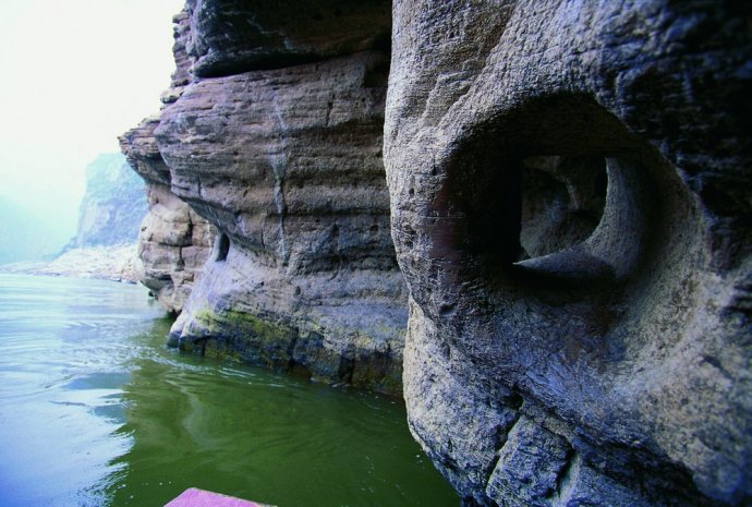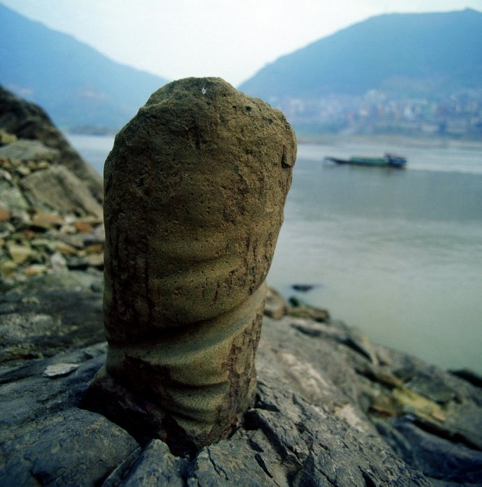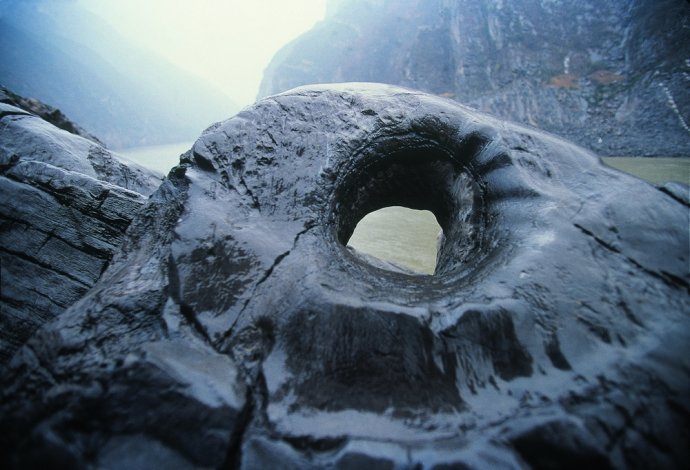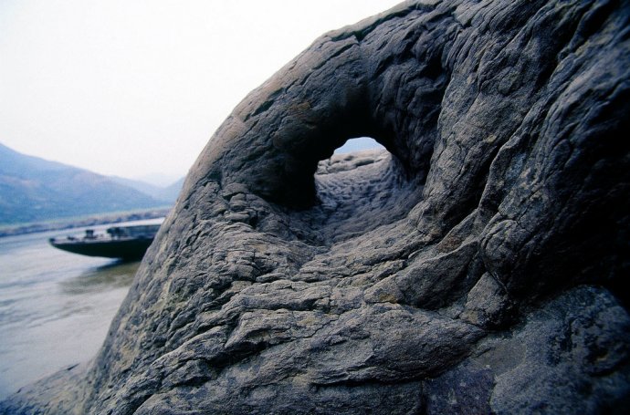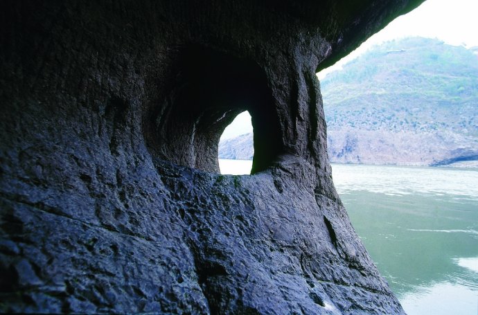 当地人将那些在石头中穿凿出的大孔形象地称为“牛鼻子”,这是人们锚船时用来拴船的基石。三峡沿岸滩多水急,当船只停靠在小码头时——往往在支流汇入主流处,那里流水更急,为了避免船只卷入漩涡或是急流中(郑云峰的“渔船”就曾有过几次这样的遭遇),人们便在岸边石头上凿出这样的牛鼻子。即使只是一艘小渔船,也至少需要拴在3个不同位置的牛鼻子上才能停稳。还有一些远离码头、垂直于江面的牛鼻子,比如白帝城锁江铁柱对面,石孔巨大无比,有人推测,那是特殊时期为了拦截途经的船只而开凿的。摄影/郑云峰