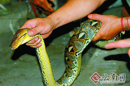 前日凌晨5點,接到景洪市畫家楊洪榮的熱線電話,記者從睡夢中躍起,驅車趕到位于版納氣象局住宿區內的一間民宅。只見其二樓陽台上燈火通明,7名男女的身影正在樓上緊張地晃來晃去,原來,楊洪榮的家中發現了一條手臂粗的蟒蛇,几人正在與蟒蛇進行著激烈的搏斗。