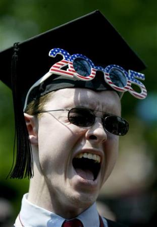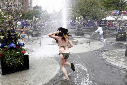 | 傳統的畢業典禮是莊重且嚴肅的,但對于現在的大學生來說,更為好玩的畢業禮,才能體現出內心的興奮和快樂!  濕身裸奔慶畢業,5月10日,在美國紐約華盛頓廣場公園,紐約大學第175屆畢業典禮結束後,大學生濕身慶畢業,帶著學位帽“裸奔”狂歡。  2005年5月27日,美國馬里蘭州,海軍學院學生慶祝領取畢業證書。  2005年6月3日,美國坎布里奇,麻省理工學院學生頭戴面具參加畢業典禮。  2008年5月28日,美國科羅拉多全泉城,總統布什參加空軍學院畢業典禮。  2008年5月28日,美國科羅拉多泉城,空軍學院畢業生將帽子扔向天空。  2005年6月9日,美國馬薩諸塞州坎布里奇,哈佛大學畢業典禮上的個性畢業生。 |